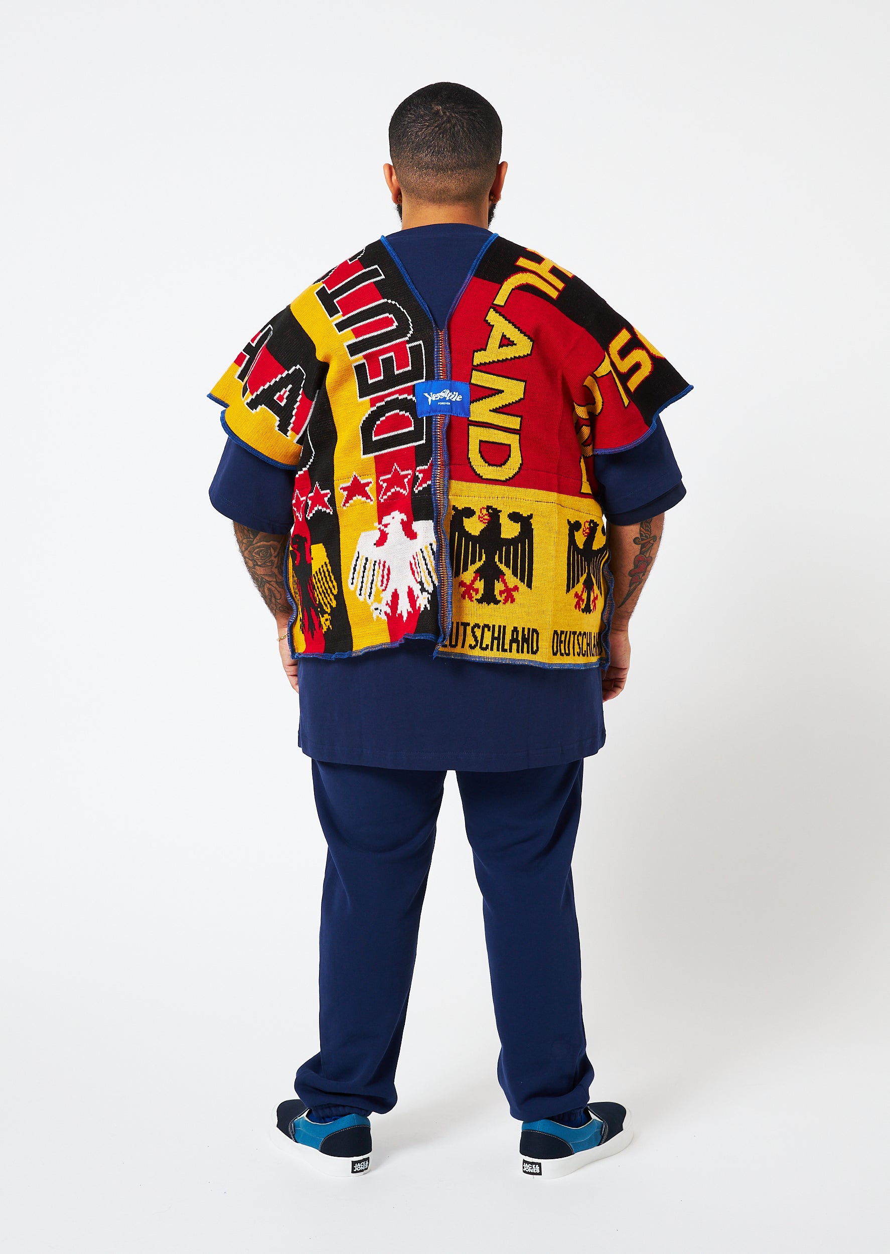 This unisex spencer is inside out wearable and adjustable in the waist with kobalt blue drawstrings. This unique knitted fabric has a comfortable touch. Easy to wear on its own or style with your own wardrobe.