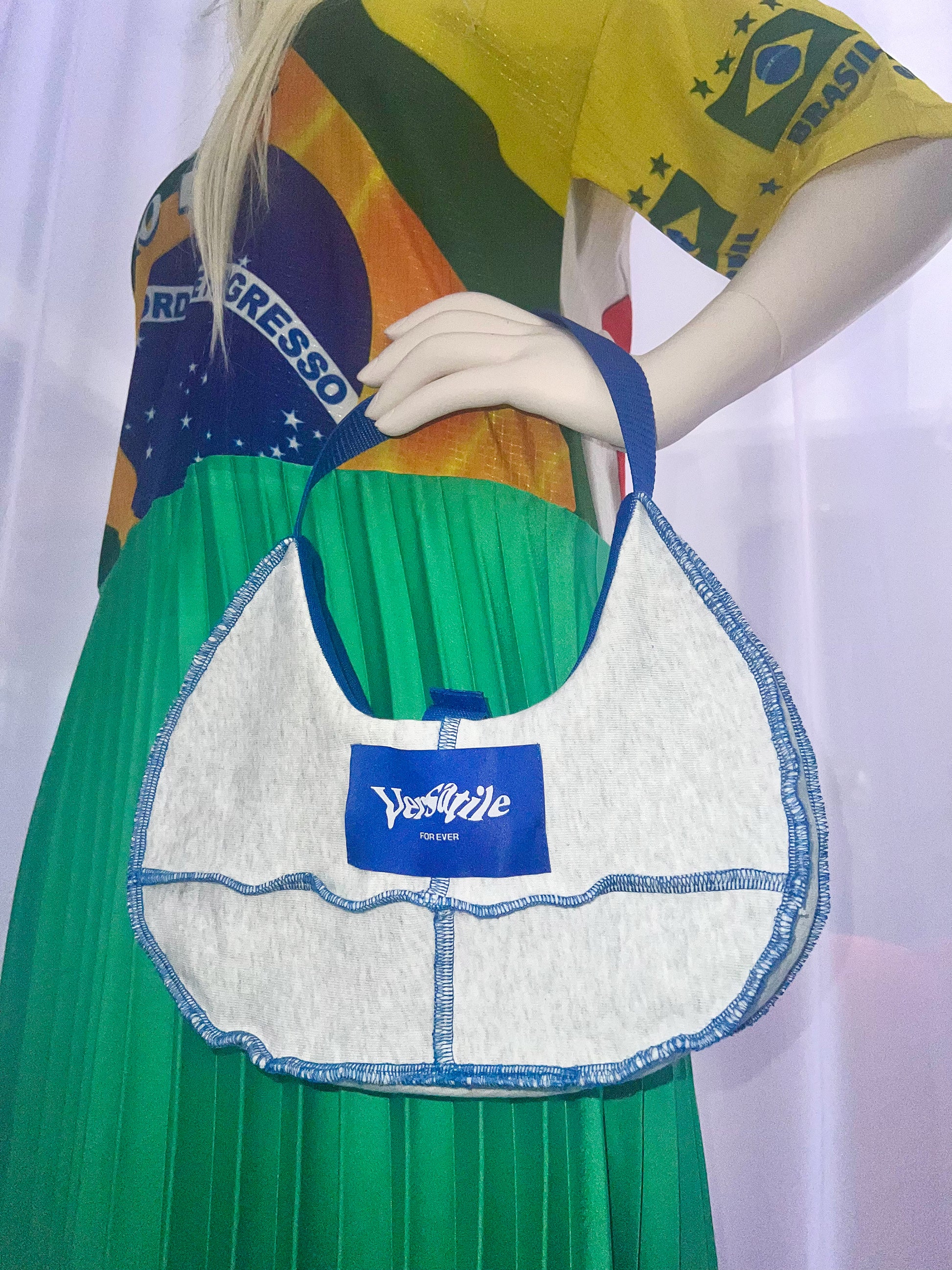 The cutest upcycled bag created for our collaboration with de Bijenkorf Rotterdam and de Wasserij. This bag is made from discarded hoodies from de Bijenkorf, with a lining. The bag has a small pocket inside and a kobalt blue strap as handle.
