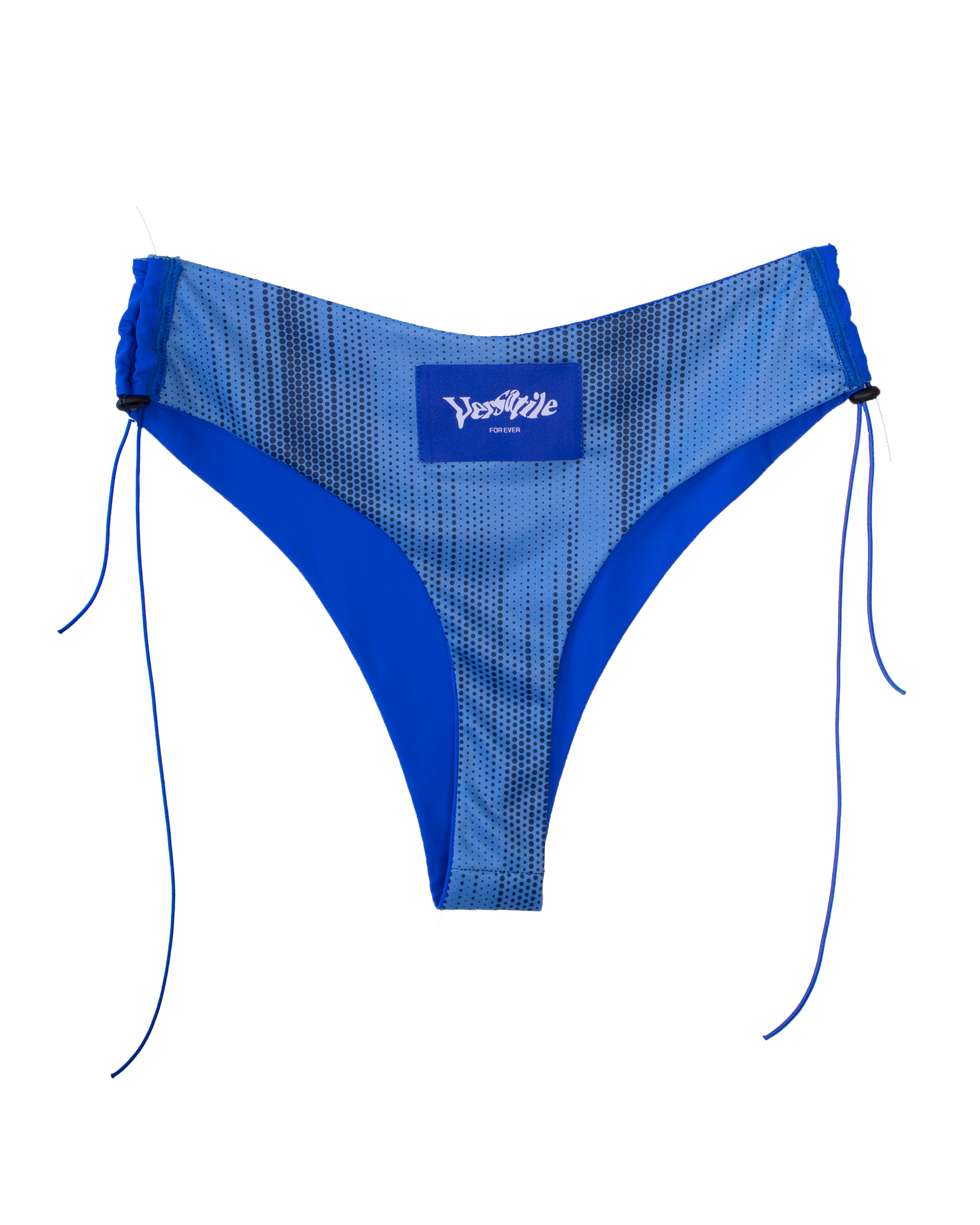 The bikini is wearable in many different ways, from front to back - making it either a thong, or more modest fit - and inside out. You can choose whether you wear the blue fabric or the soccer fabric on the outside.