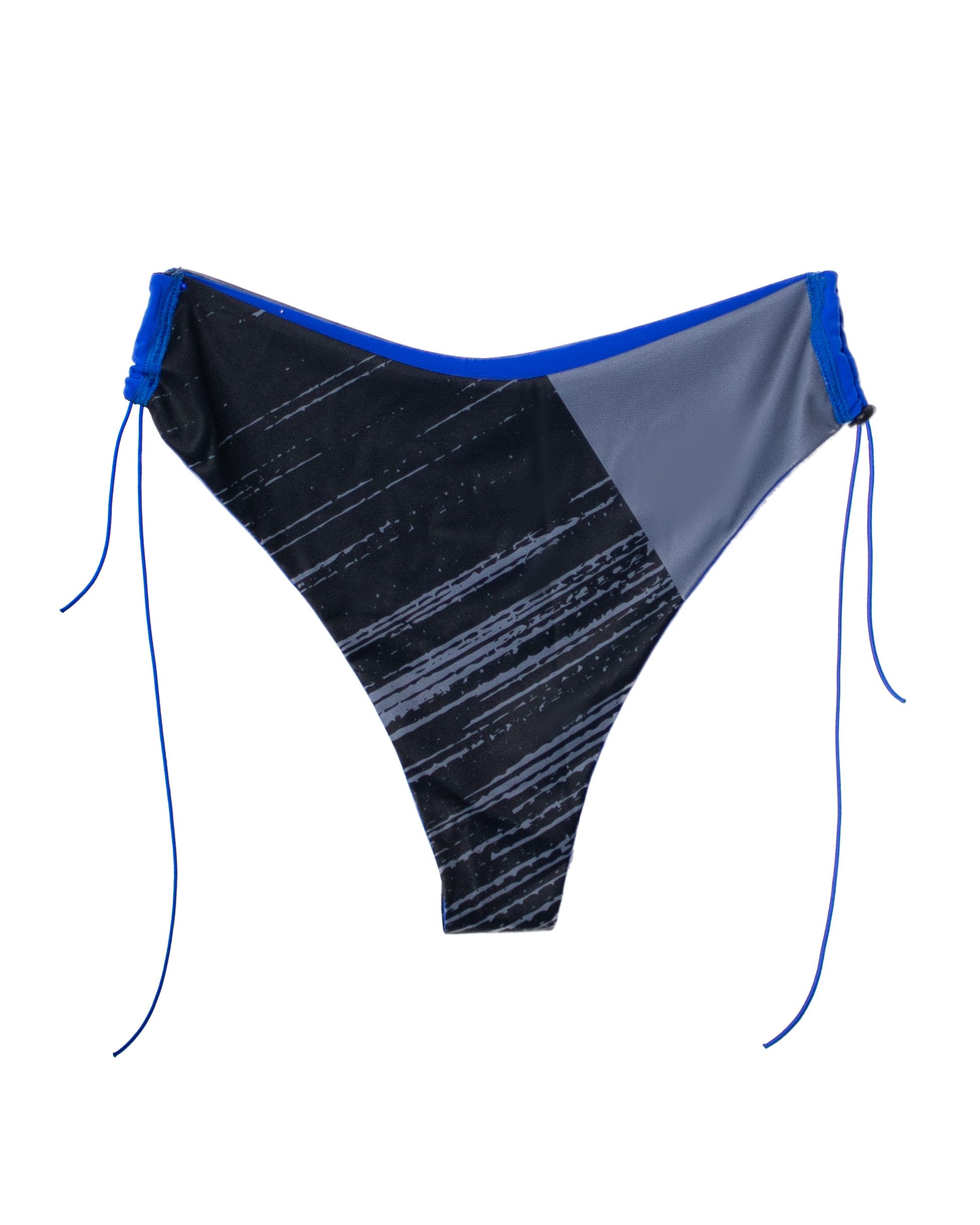 The bikini is wearable in many different ways, from front to back - making it either a thong, or more modest fit - and inside out. You can choose whether you wear the blue fabric or the soccer fabric on the outside.