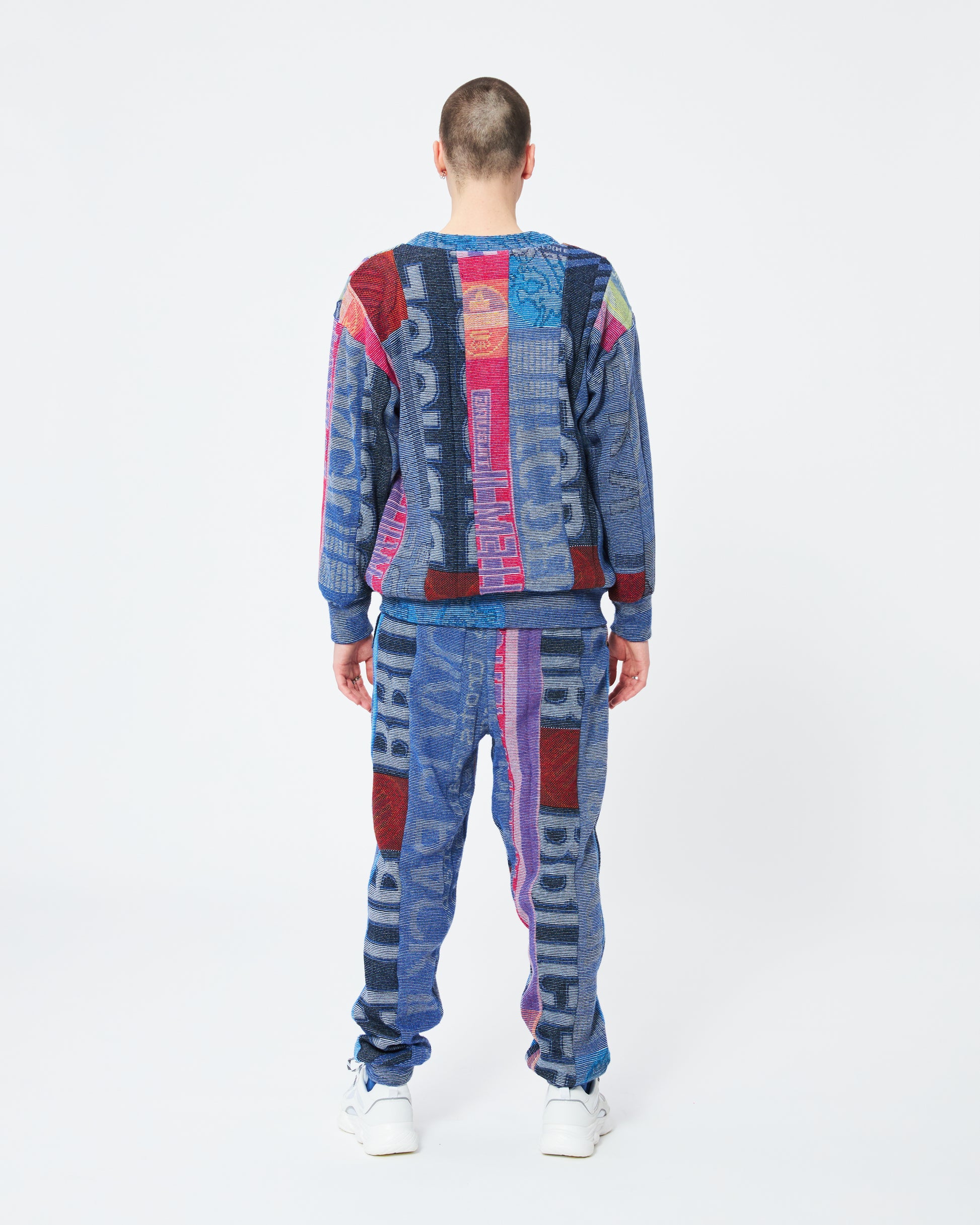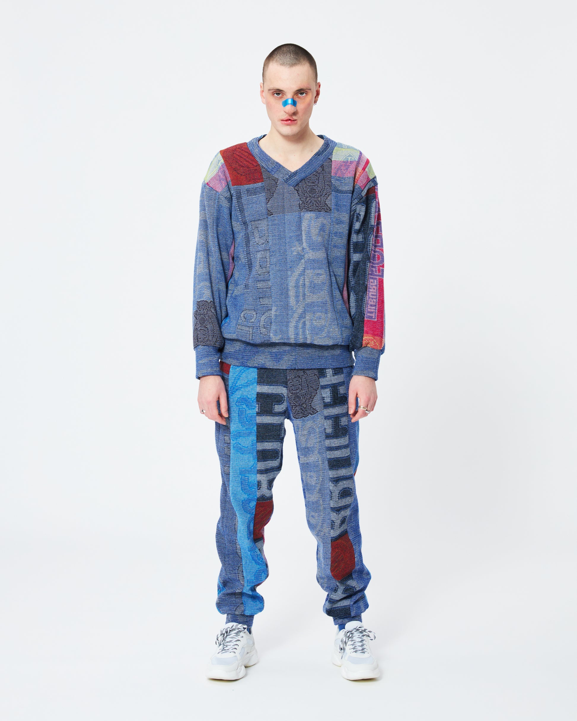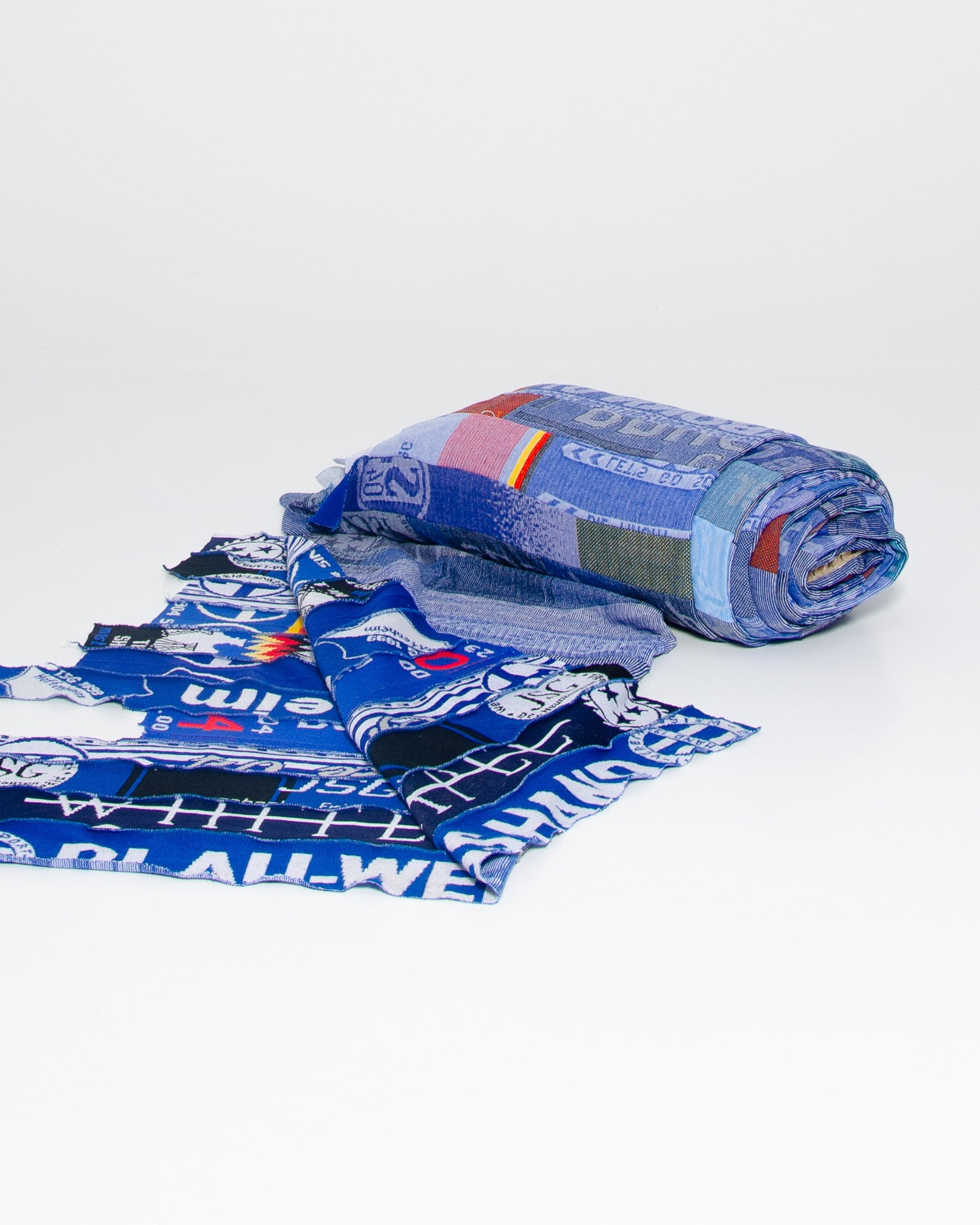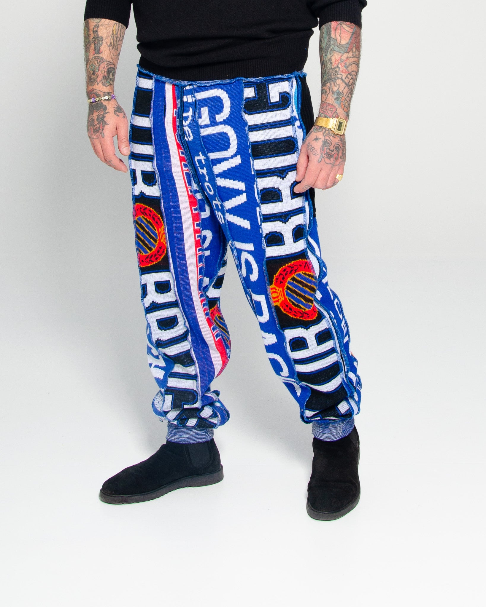 This reversible jogger is created from vintage soccer scarves in blue tones, cut in pieces and sewn back together to create a unique pattern.