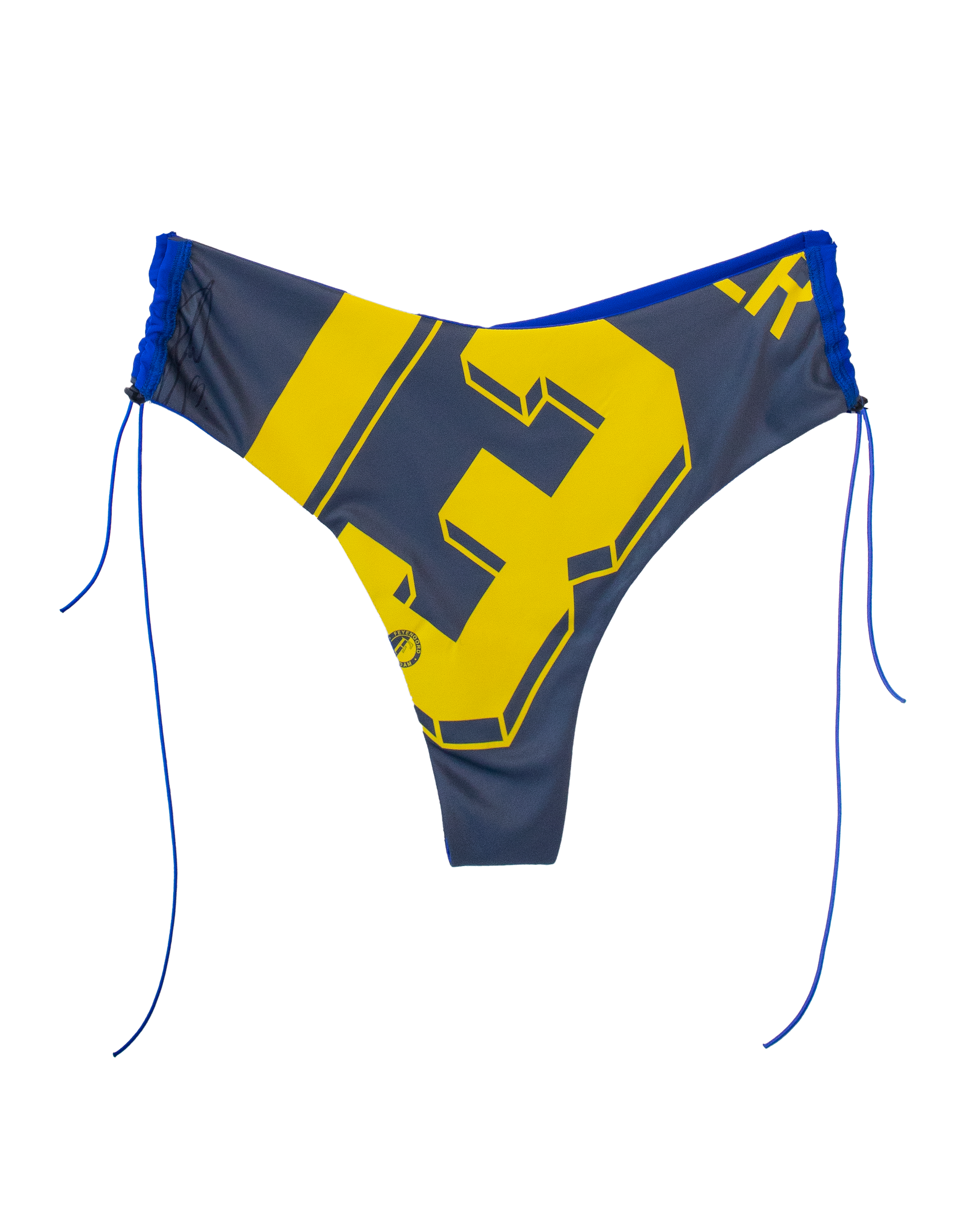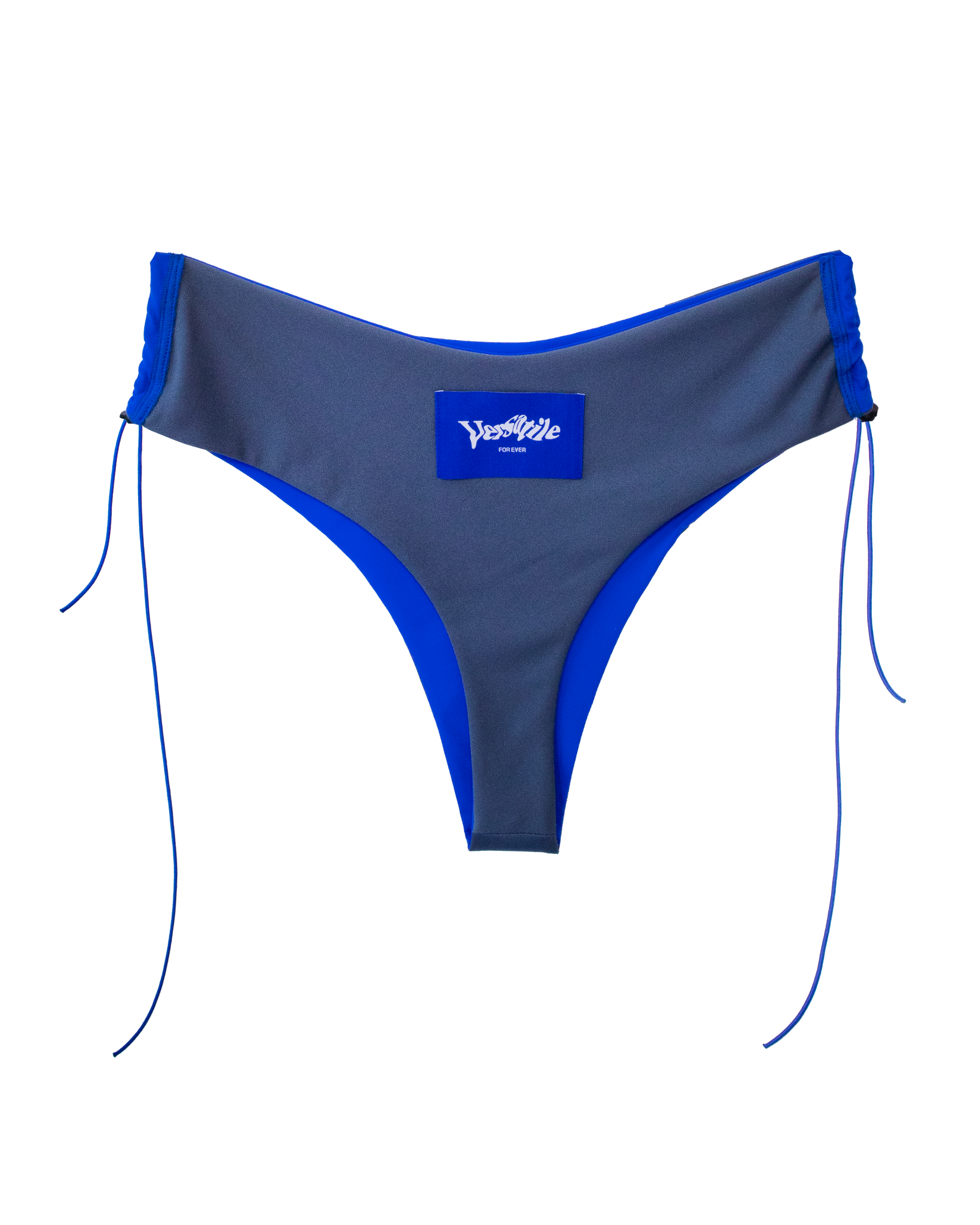The bikini is wearable in many different ways, from front to back - making it either a thong, or more modest fit - and inside out. You can choose whether you wear the blue fabric or the soccer fabric on the outside.