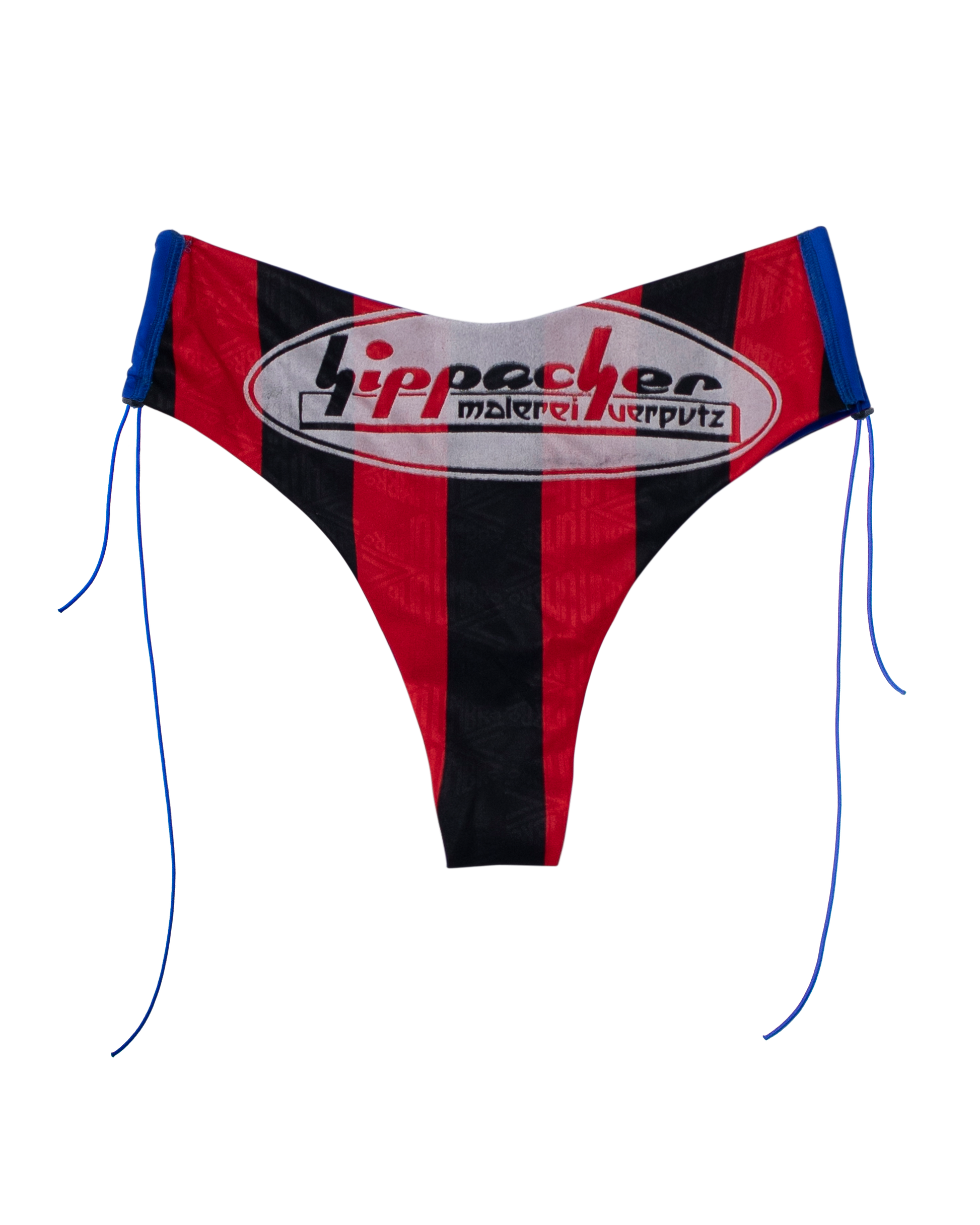 The bikini is wearable in many different ways, from front to back - making it either a thong, or more modest fit - and inside out. You can choose whether you wear the blue fabric or the soccer fabric on the outside.