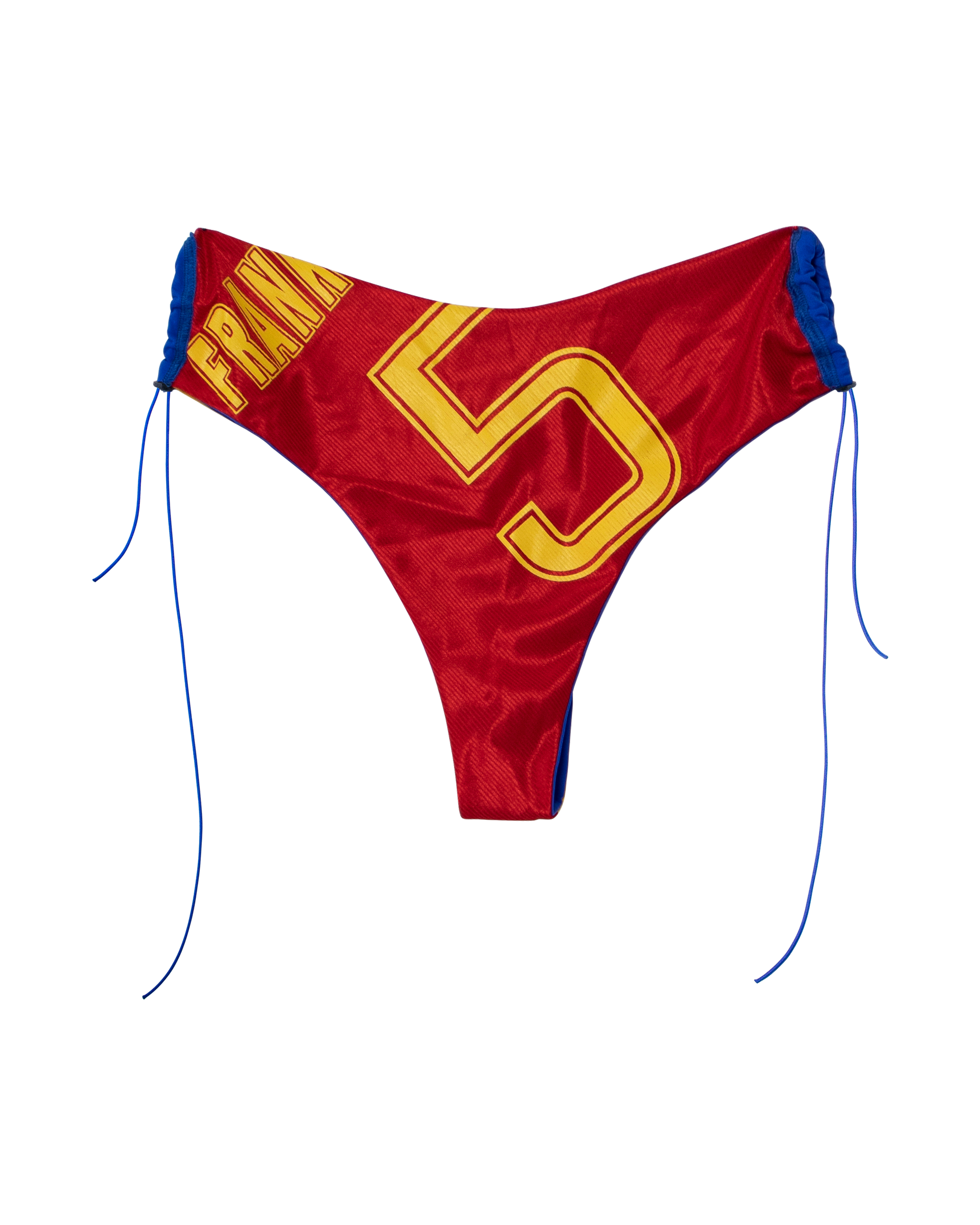 The bikini is wearable in many different ways, from front to back - making it either a thong, or more modest fit - and inside out. You can choose whether you wear the blue fabric or the soccer fabric on the outside.