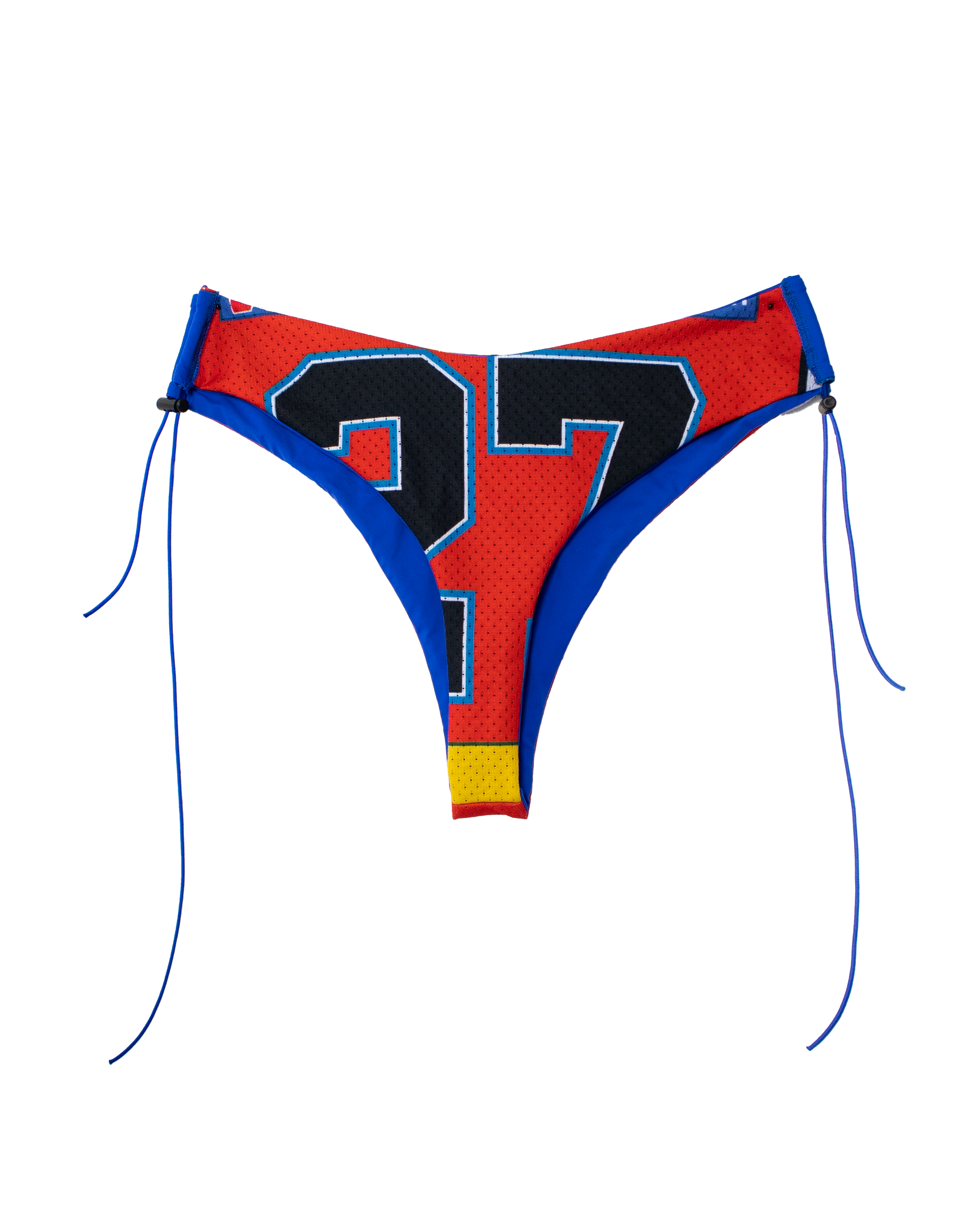Our famous soccer bikinis are making a comeback! The brief has an improved fit and is wearable in many different ways, from front to back - making it either a thong, or more modest fit - and inside out. You can choose whether you wear the blue fabric or the soccer fabric on the outside. The fit is adjustable with the drawstrings on the side and comes in 3 different size ranges: size 1, 2 and 3. These sizes are multi interpretable, you want more revealing? Size down. You want more modest? Size up.