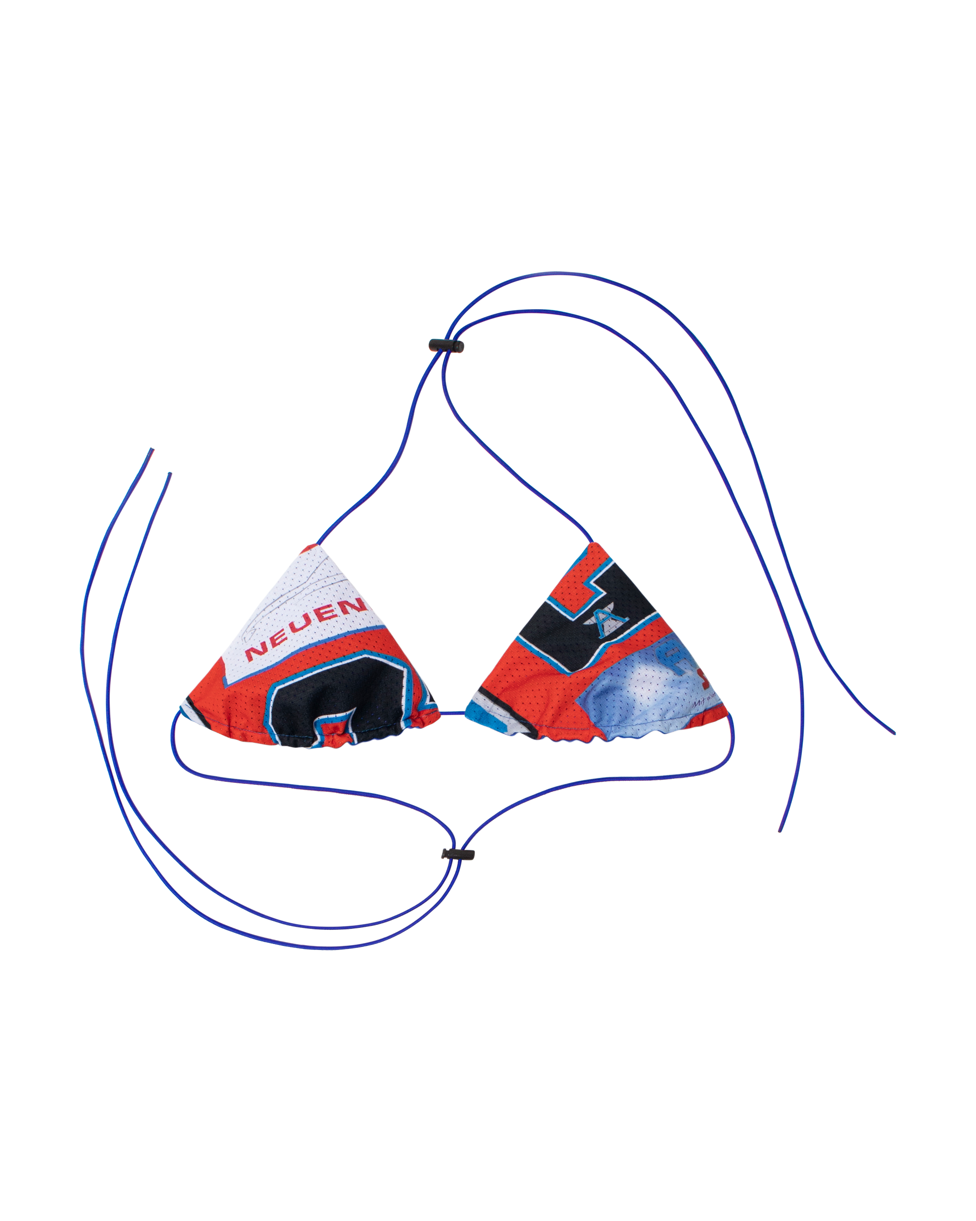 The bikini is wearable in many different ways, from front to back - making it either a thong, or more modest fit - and inside out. You can choose whether you wear the blue fabric or the soccer fabric on the outside.