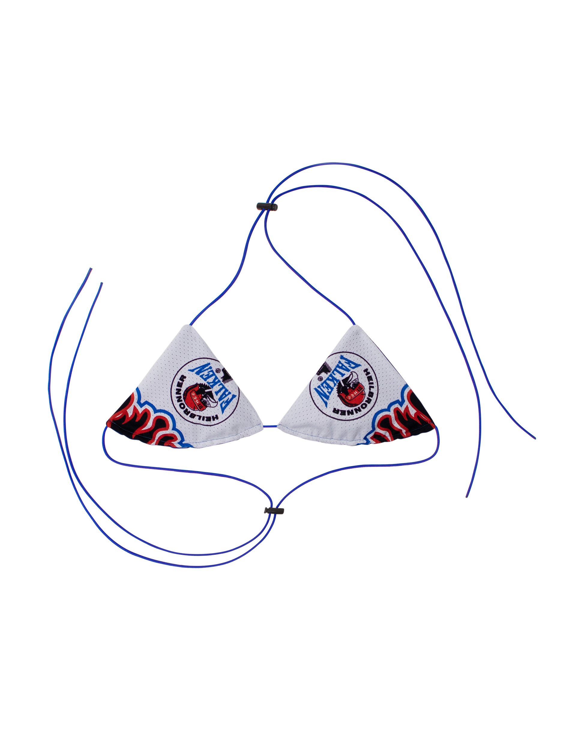 The bikini is wearable in many different ways, from front to back - making it either a thong, or more modest fit - and inside out. You can choose whether you wear the blue fabric or the soccer fabric on the outside.
