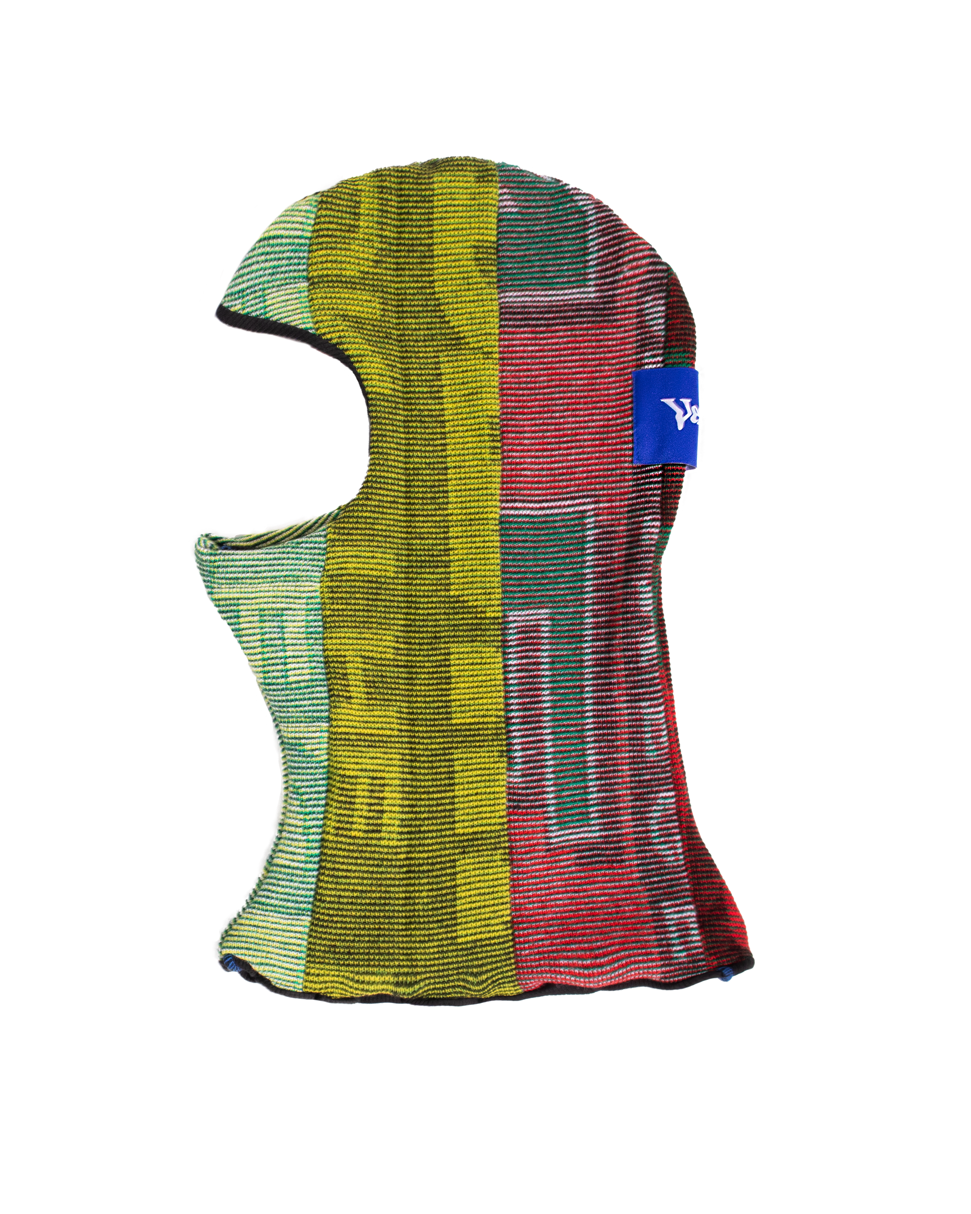 Created from vintage soccer scarves, the balaclava is the perfect addition to your winter wardrobe. The material is warm but breathable and lined with a soft black rib fabric. The balaclava is available in one size and is easy to put on due to the stretchy fabric. You can wear this accessory completely over the mouth and nose or just under the chin.