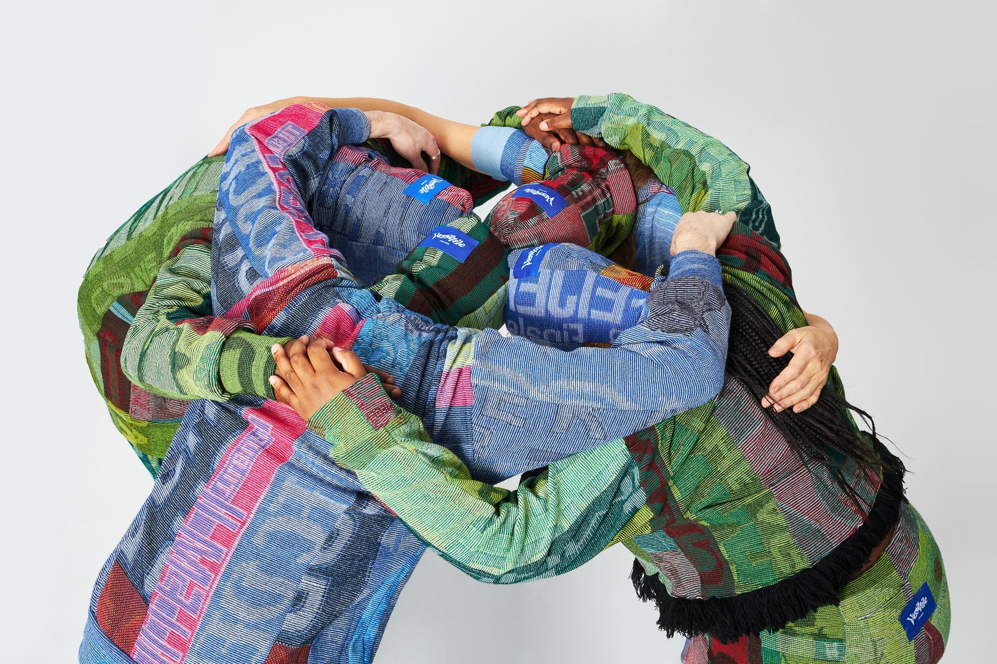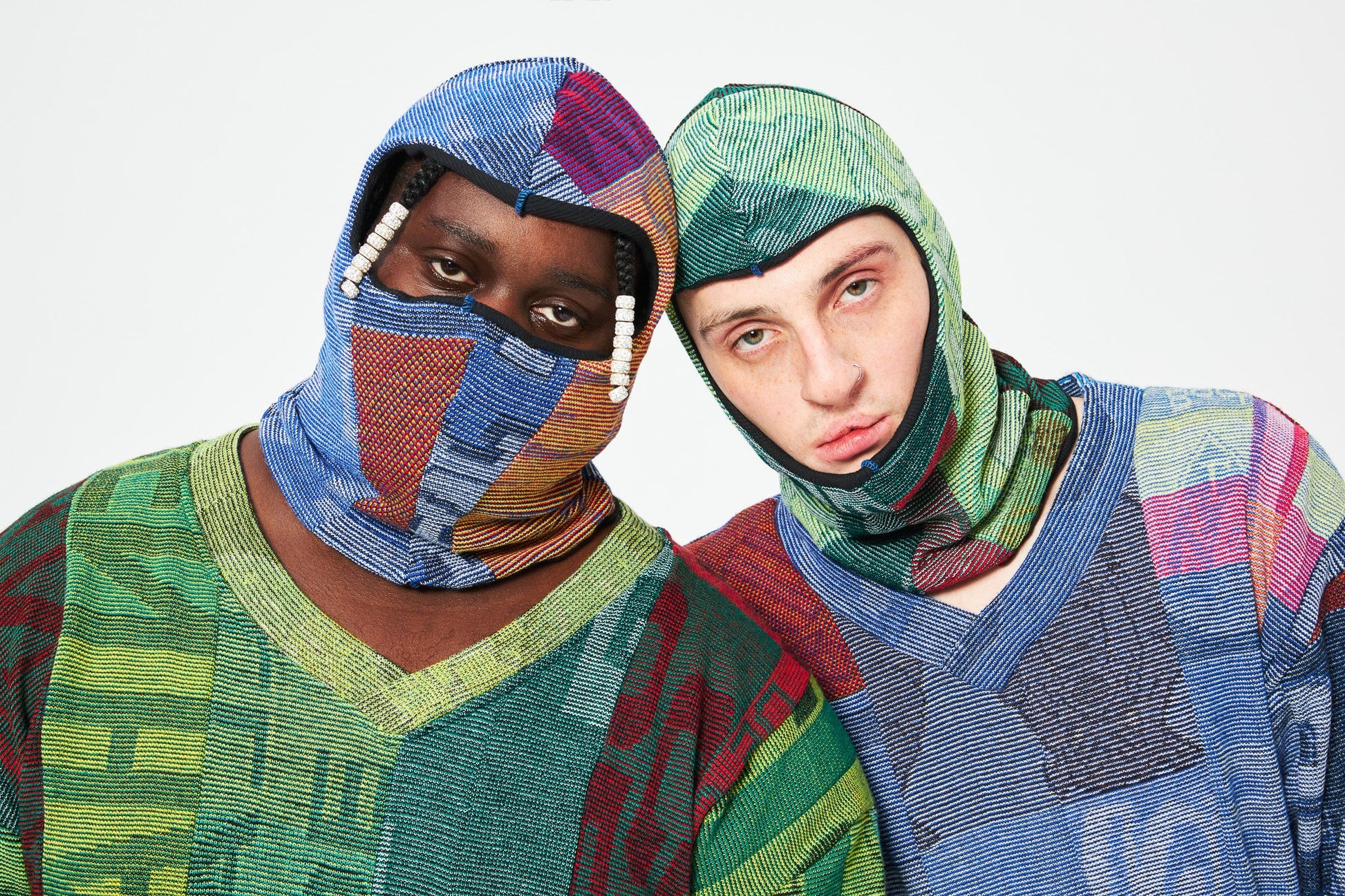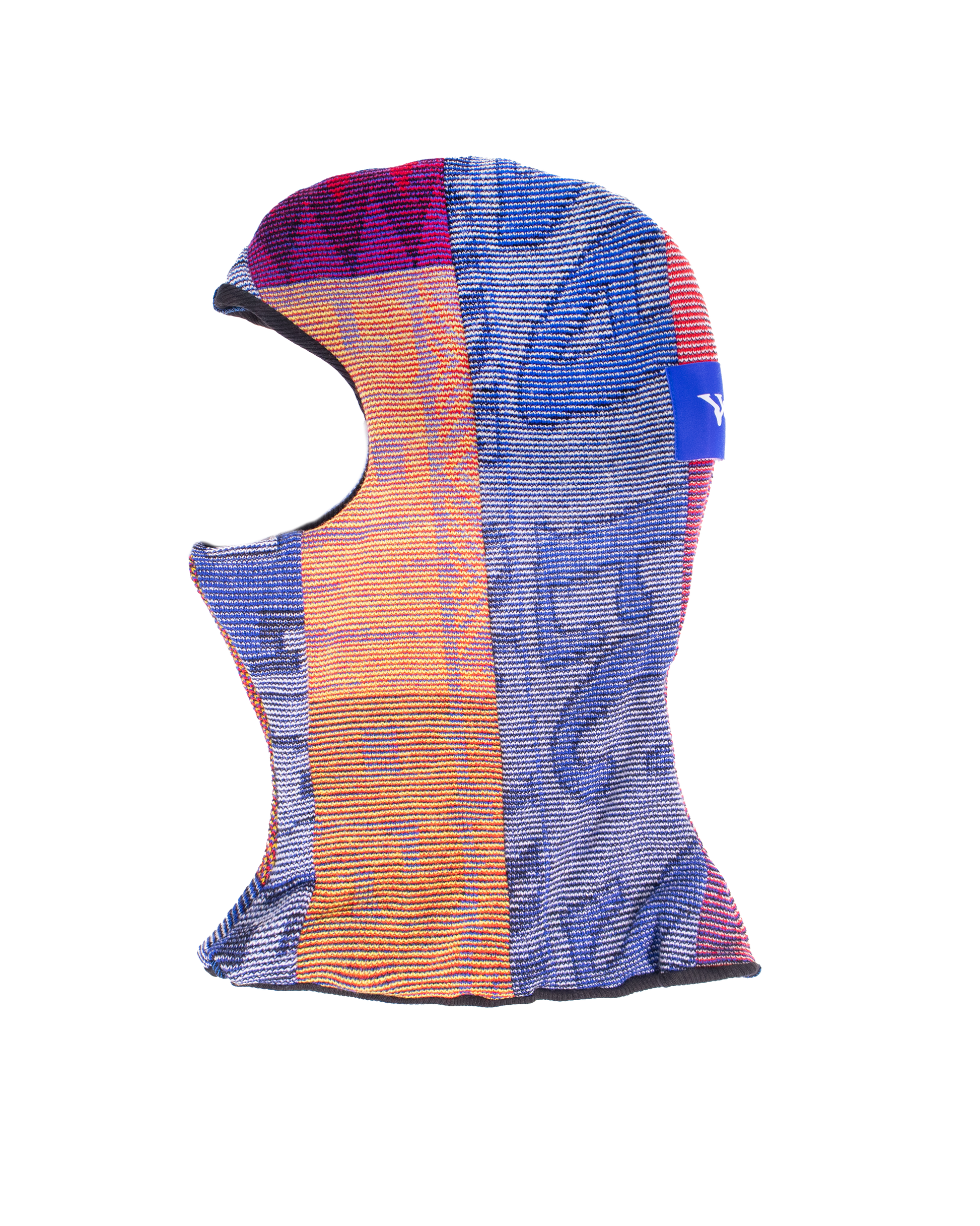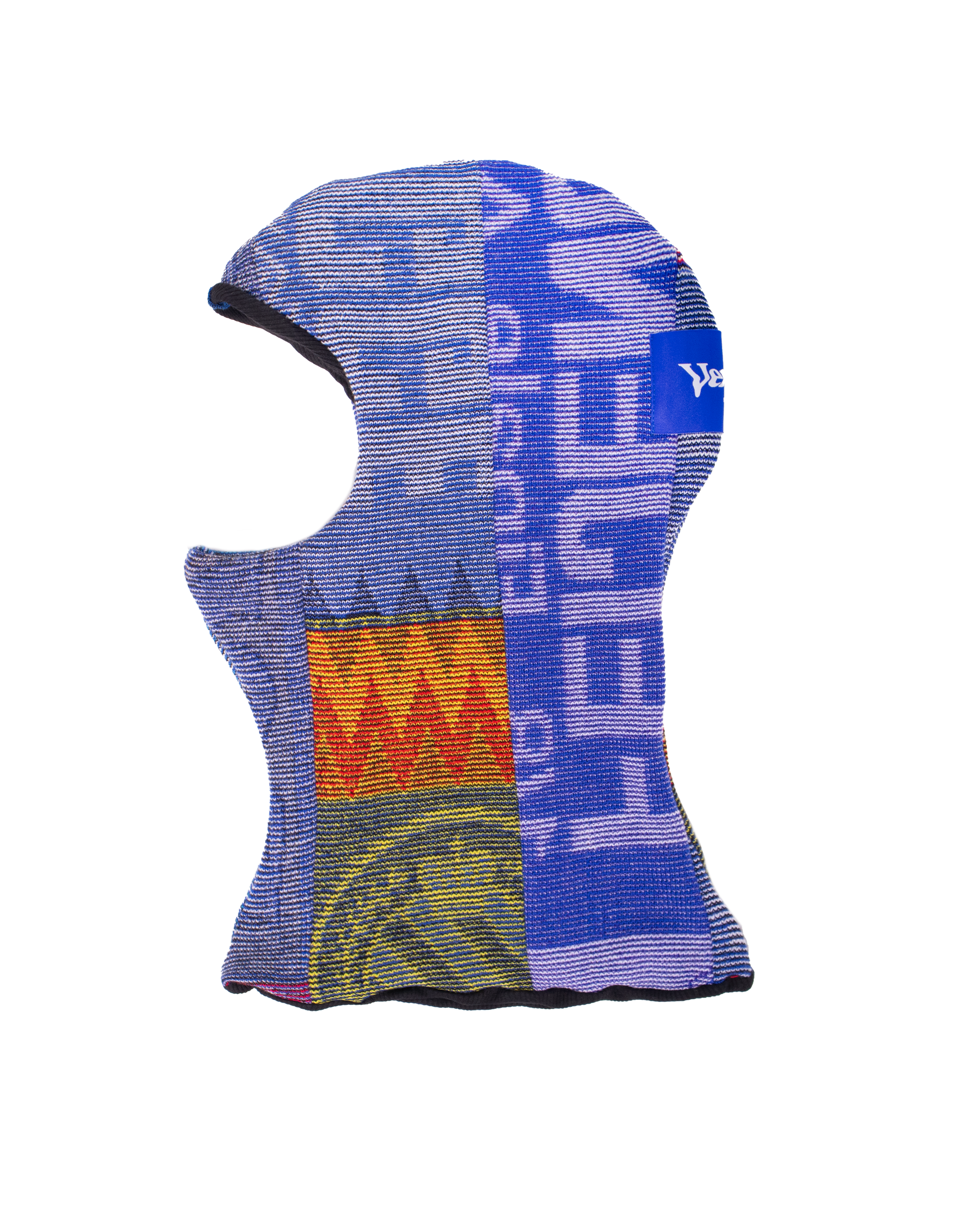 Created from vintage soccer scarves, the balaclava is the perfect addition to your winter wardrobe. The material is warm but breathable and lined with a soft black rib fabric. The balaclava is available in one size and is easy to put on due to the stretchy fabric. You can wear this accessory completely over the mouth and nose or just under the chin.