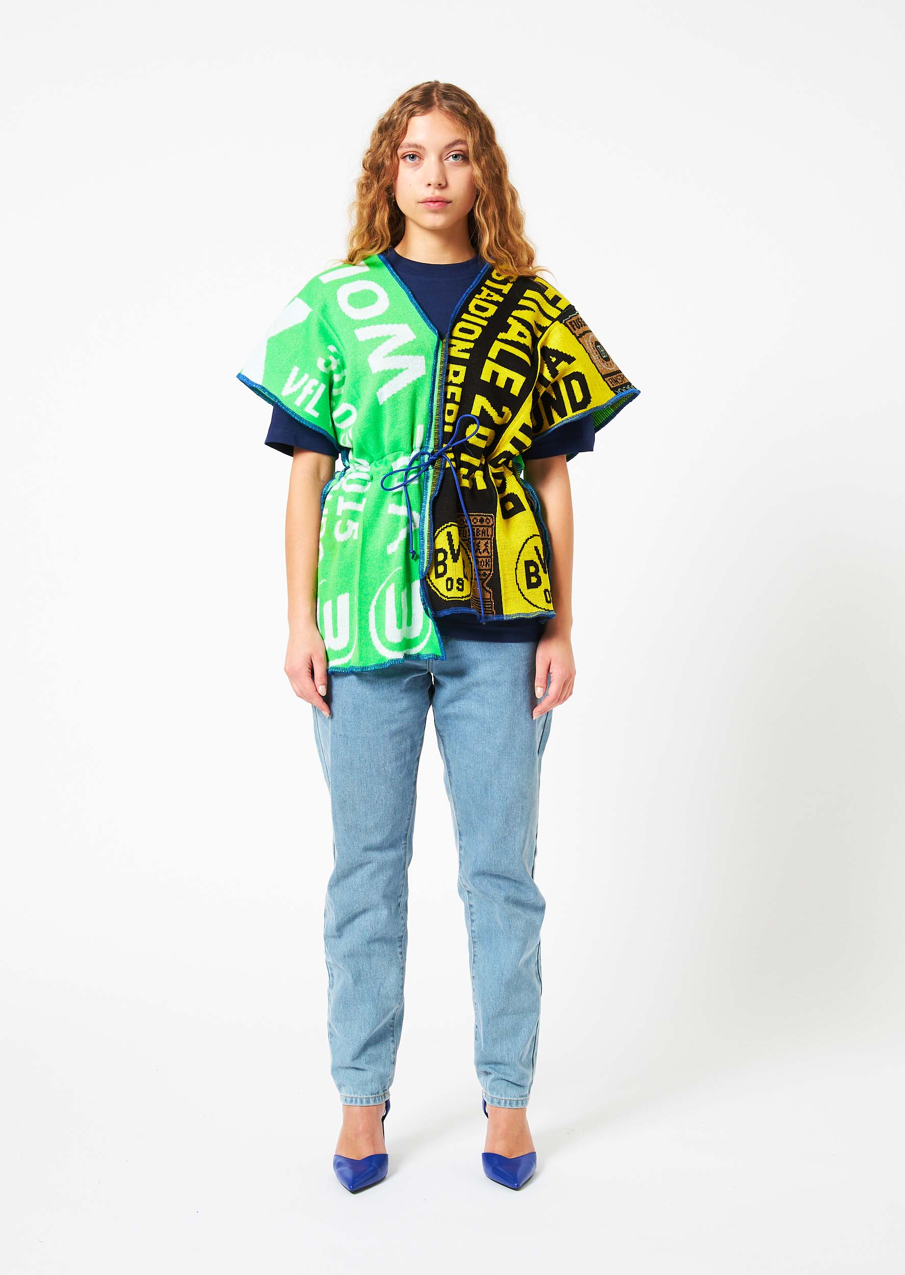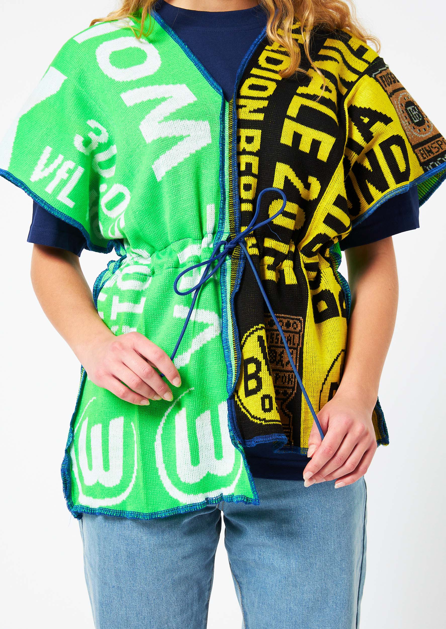 This unisex spencer is inside out wearable and adjustable in the waist with kobalt blue drawstrings. This unique knitted fabric has a comfortable touch. Easy to wear on its own or style with your own wardrobe.