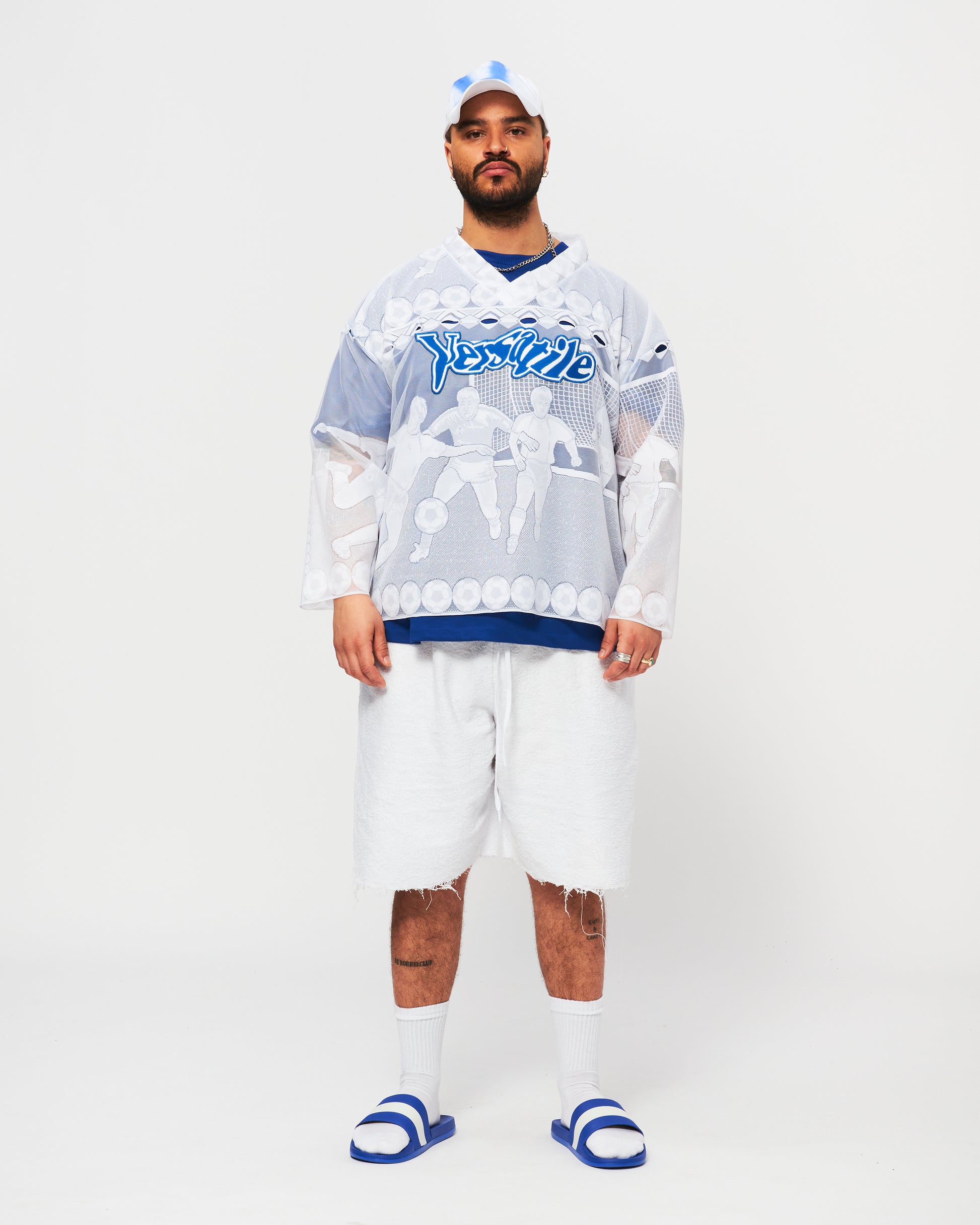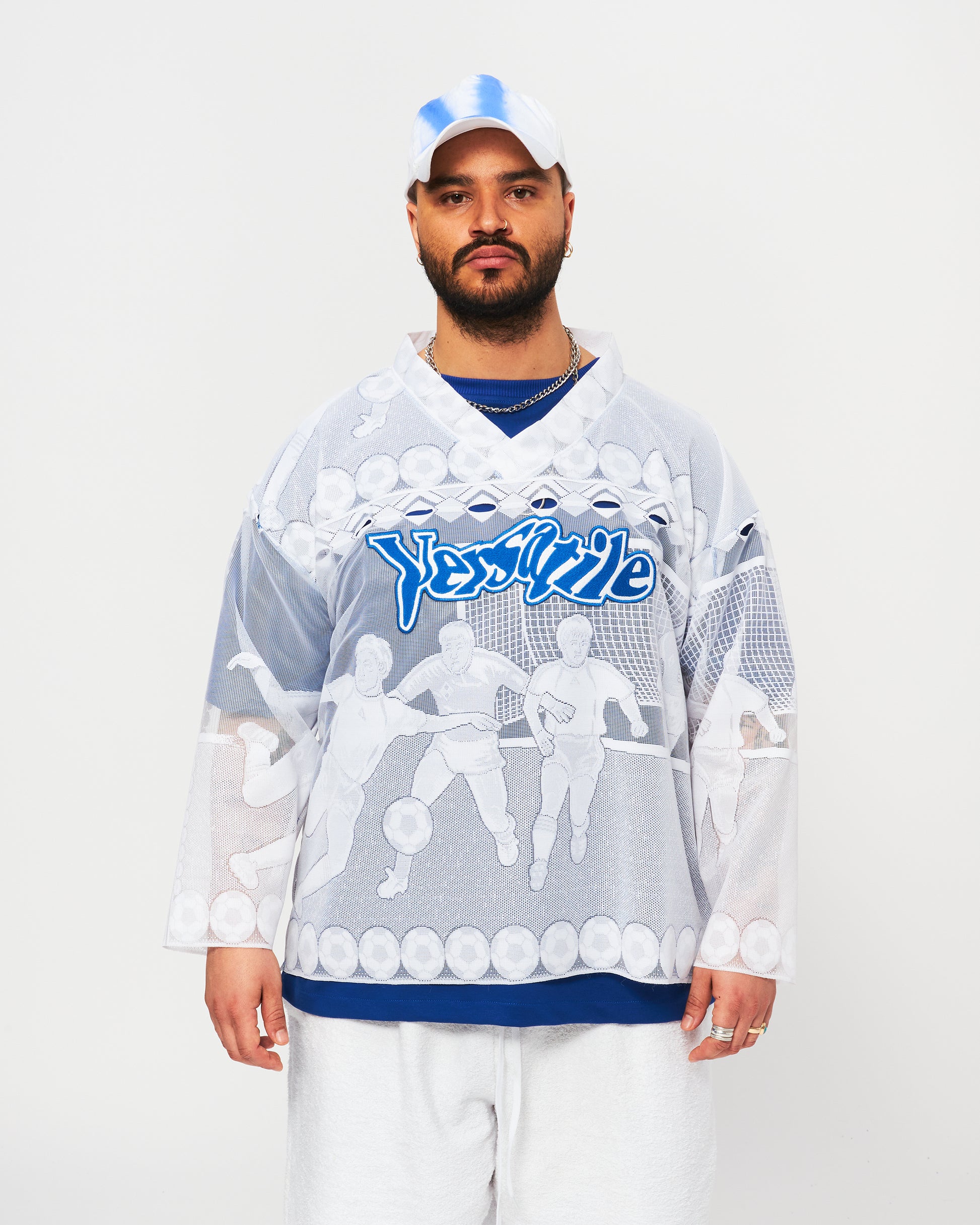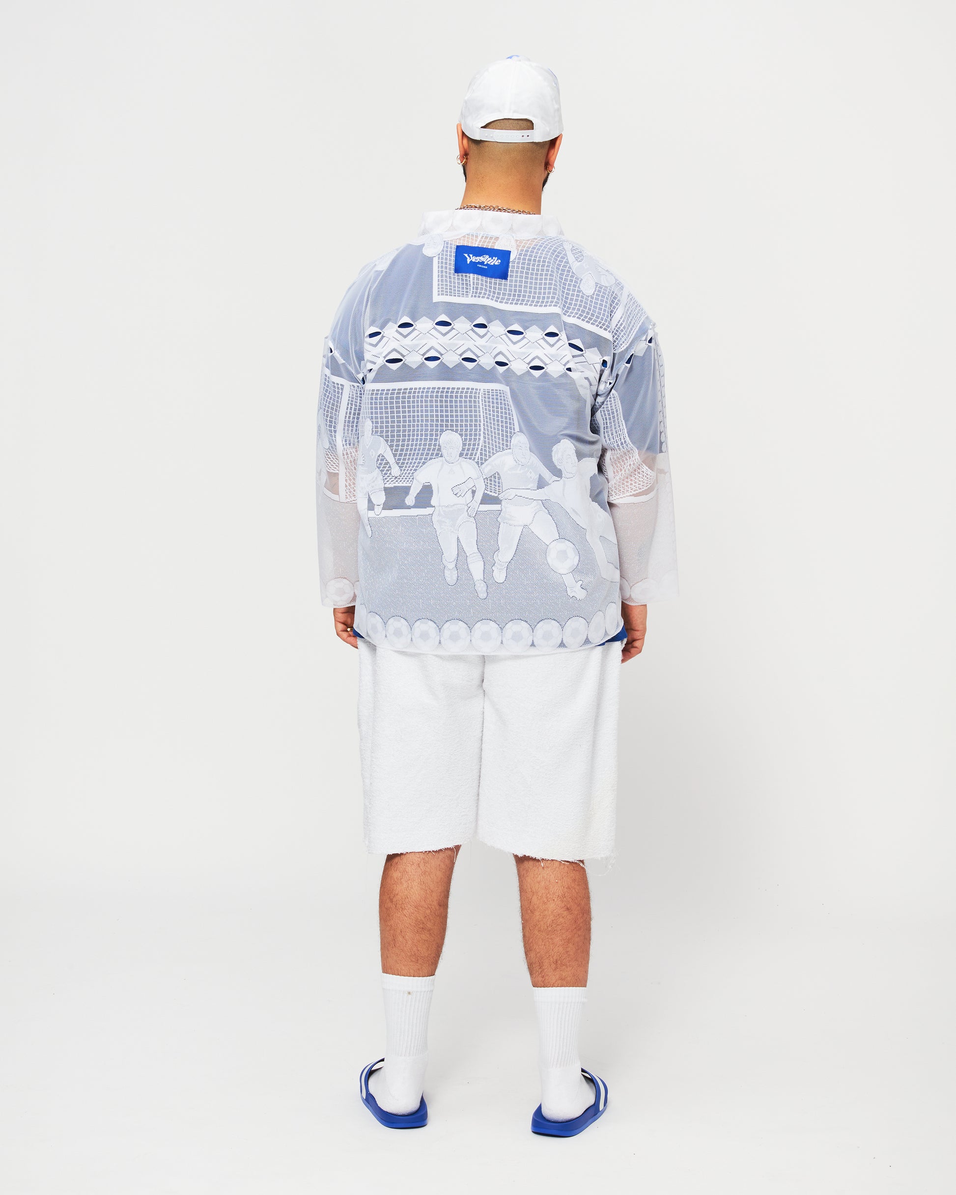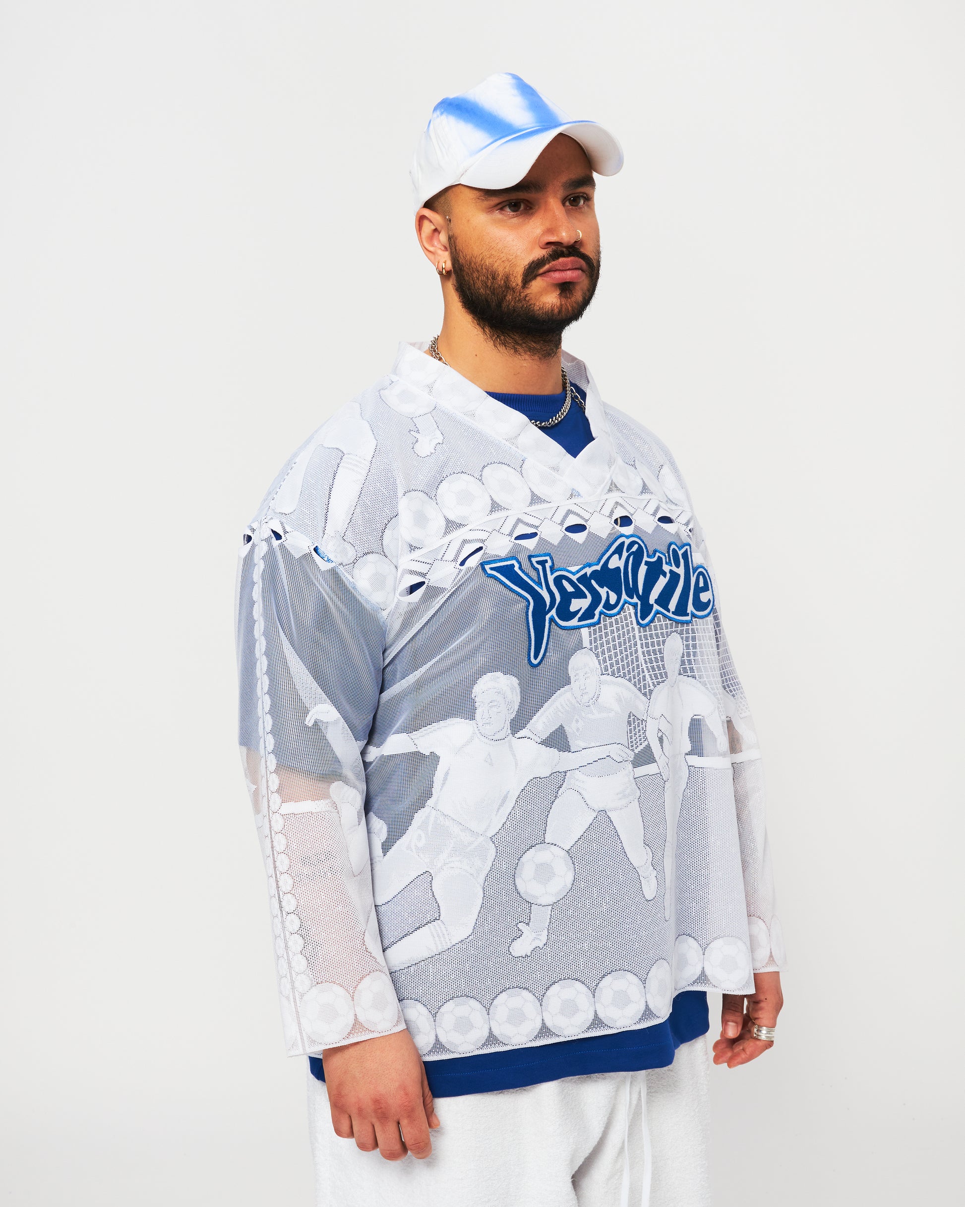 This jersey is created from up cycled lace curtains that display a soccer match. This style has an oversized soccer jersey fit and comes in two sizes. Wear this style on top of your outfit or just with bare skin underneath.